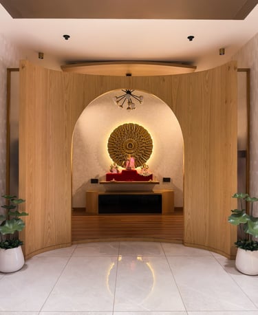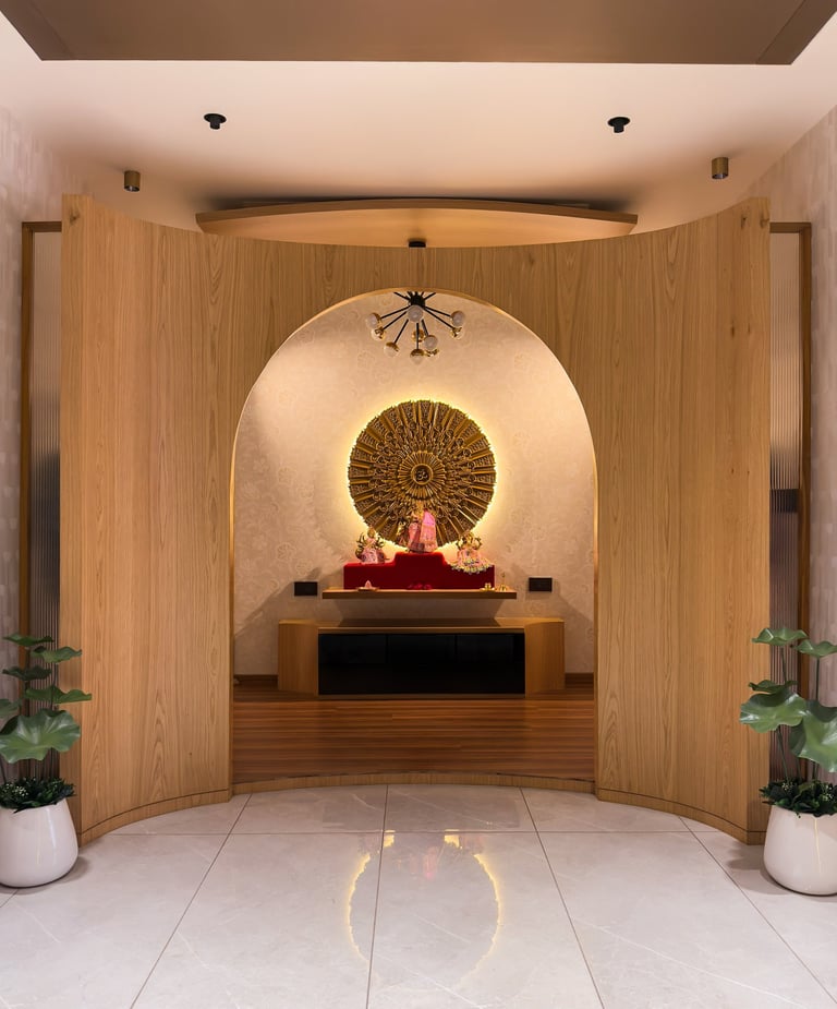 On one of our projects, we designed a pooja space on the first floor right where the staircase and lift open up. As you reach the top, a large arched gateway frames your view, and through that arch, your eyes land directly on the idol’s face. It’s not a loud design, but it’s deeply intentional.